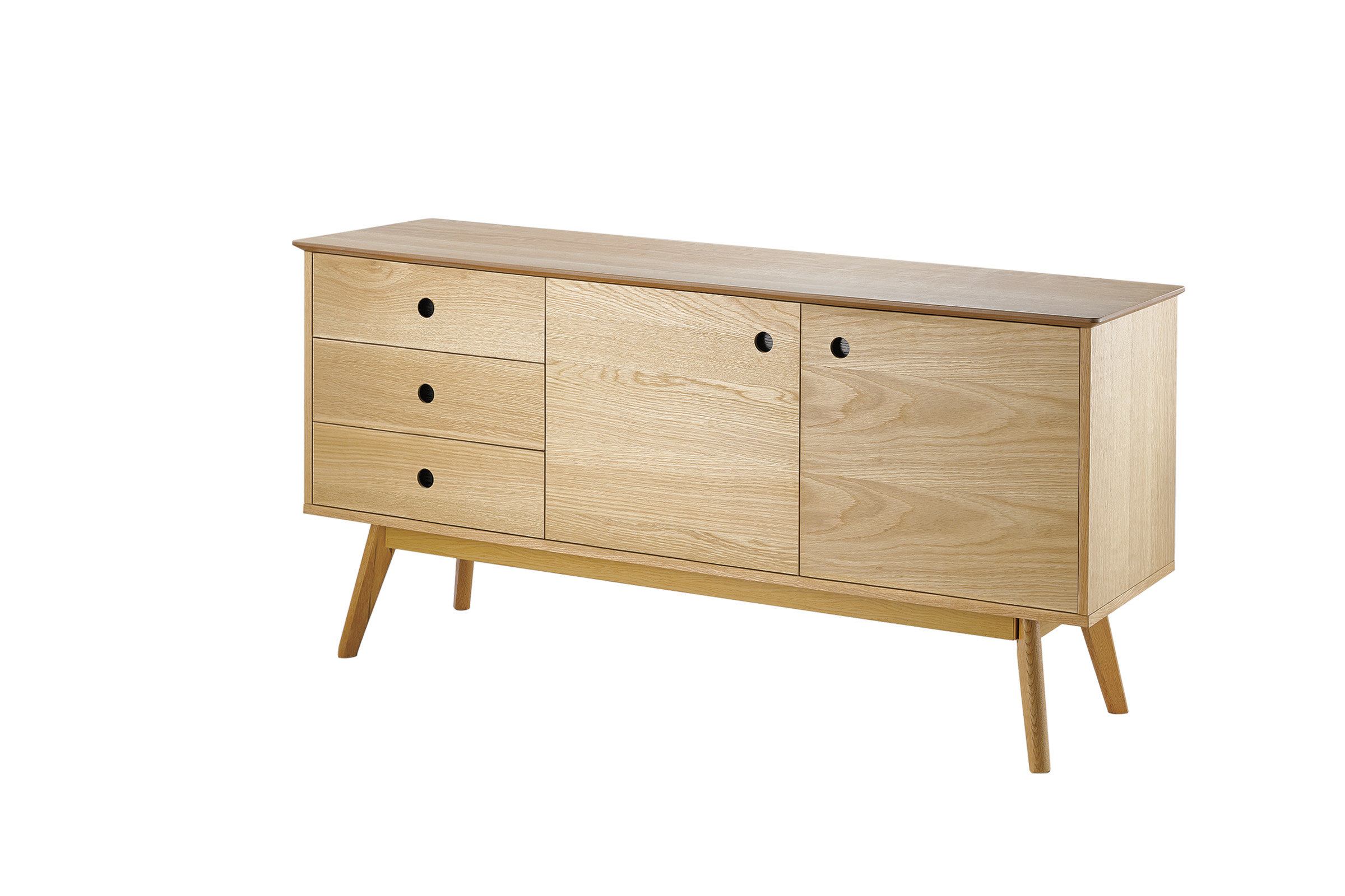 Aparador con tres cajones y dos compartimentos, MDF de 18mm, con chapilla, manijas y patas en roble