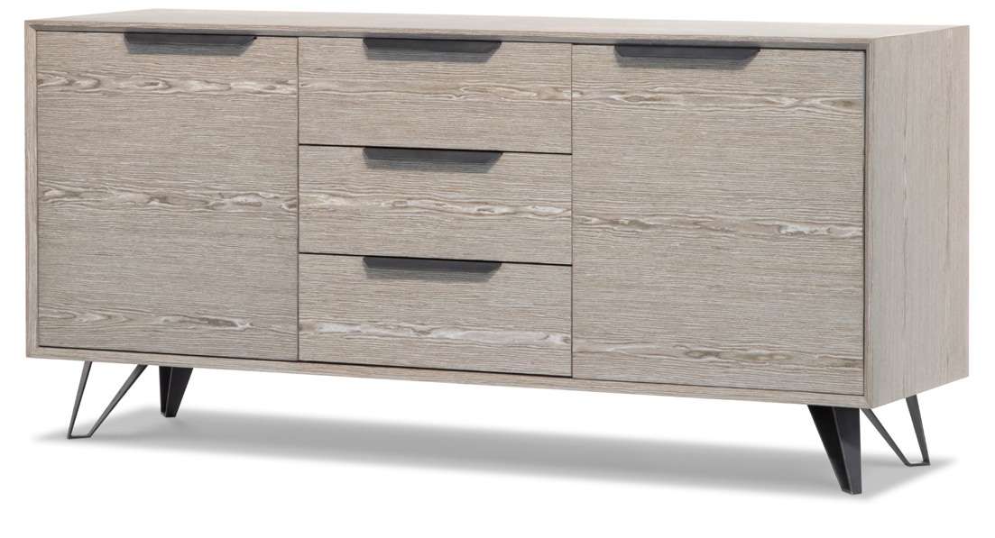 Aparador enchapado en MDF con manijas y patas metálicas.