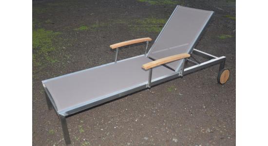 Asoleadora Descansadora para exteriores con ruedas para desplazarla apoya brazos en madera su estructura en aluminio y tela en malla gris