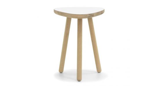 Banca hecha en roble superficie en forma circular sus tres patas delgadas.