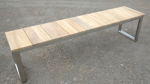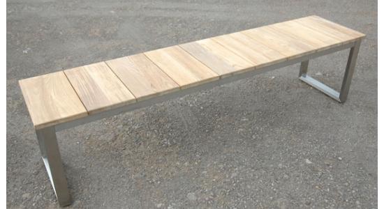 Banca para exteriores hecha en madera y patas de aluminio en forma cuadrada