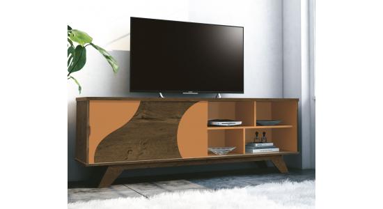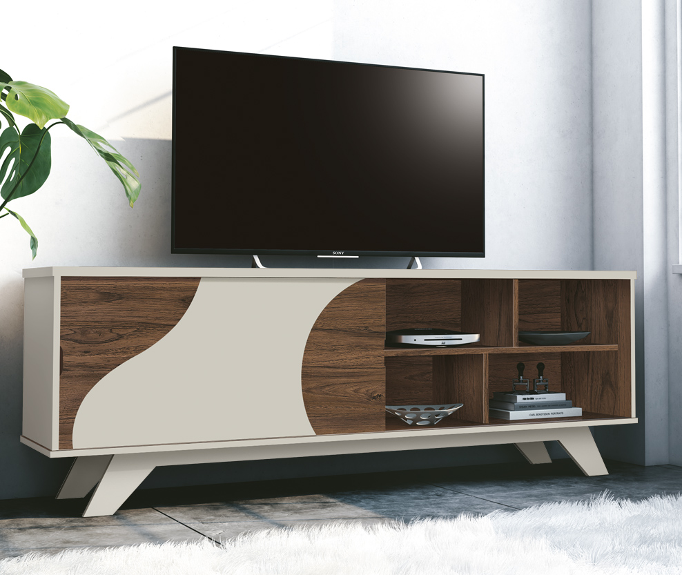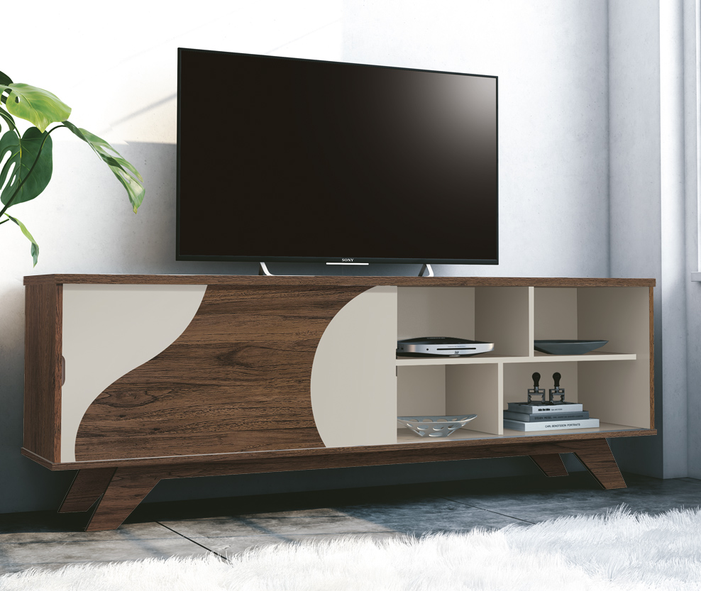 Centro de entretenimiento duotono, puerta de correr, patas en madera maciza, pintura UV de alta calidad.