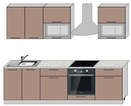 Tablero aglomerado 16m m, Fachada MDF patinado 16mm, Tablero aglomerado de las cajas estándar de la guía del rodillo, Manija del metal, pierna ajustable H100, perchas ajustables, Secado blanco con la paleta. Un zócalo de aglomerado con un sellador. Nota: Versiones con encimera aglomerado 28mm y sin encimera.