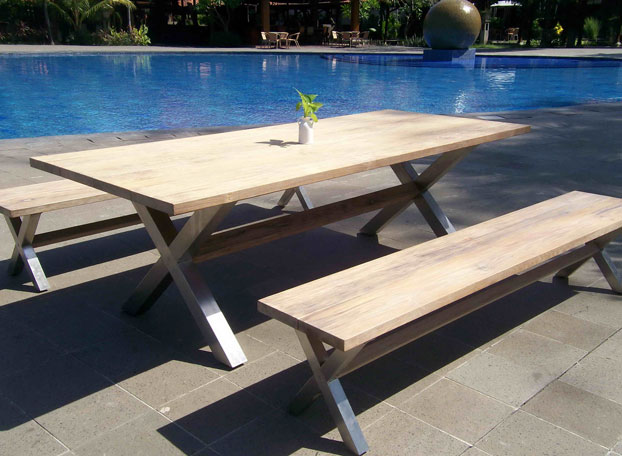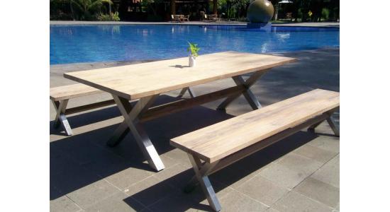 Comedor para exteriores con bancas largas en madera y estructura en aluminio en forma de x para acomodarlo a diferentes espacios al aire libre en centros comerciales, hoteles, centros recreativos y restaurantes