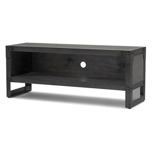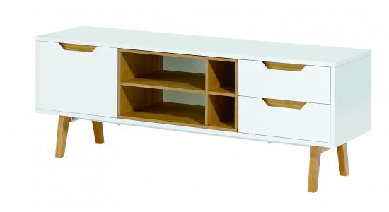 Mesa blanca para TV y sonido en MDF de 18mm, estilo retro con un compartimento, cuatro repisas, dos cajones estructura y patas en roble.