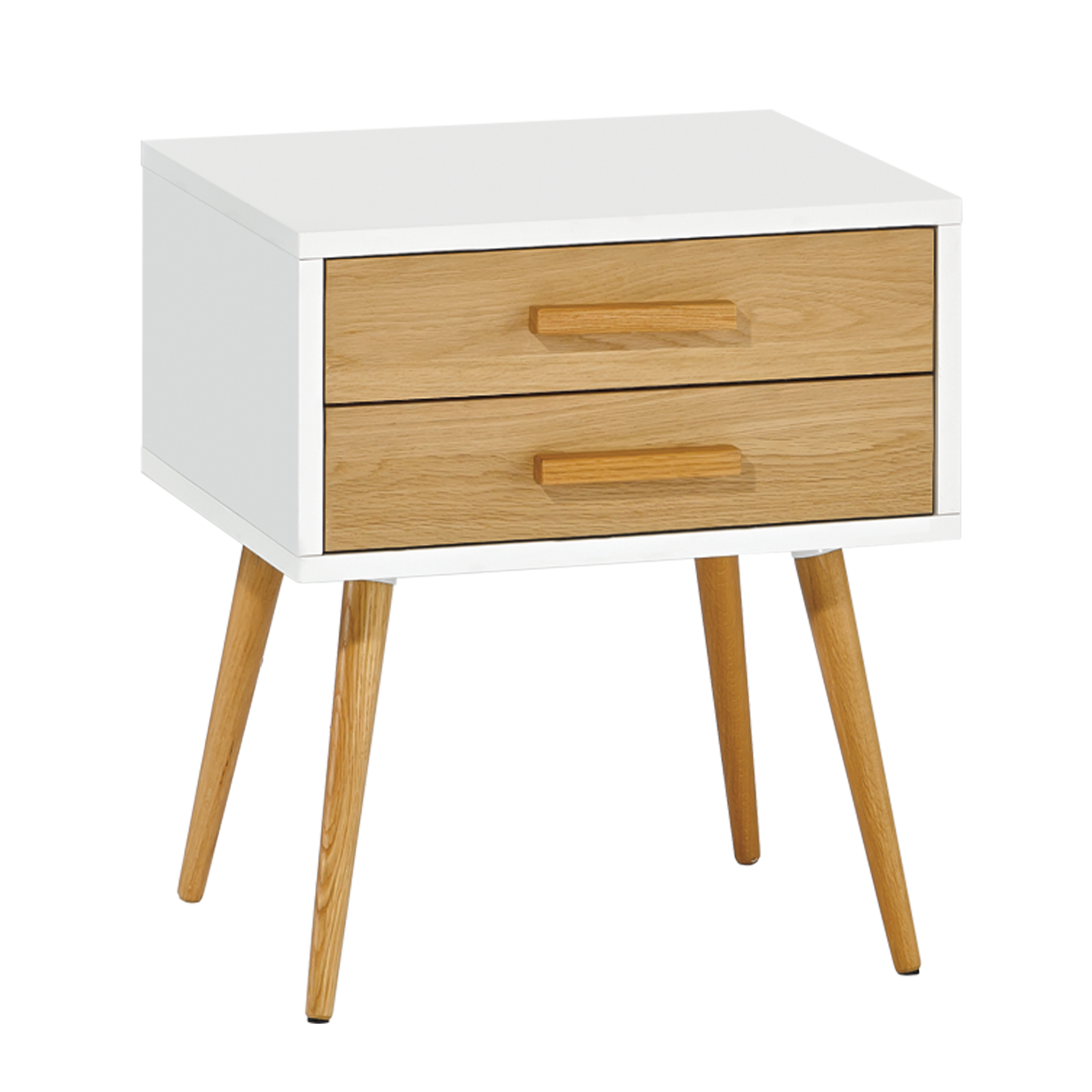 Mesa de noche en MDF de 18 mm ,PU blanco, dos cajónes con chapilla de roble y patas mazisas en madera de roble.