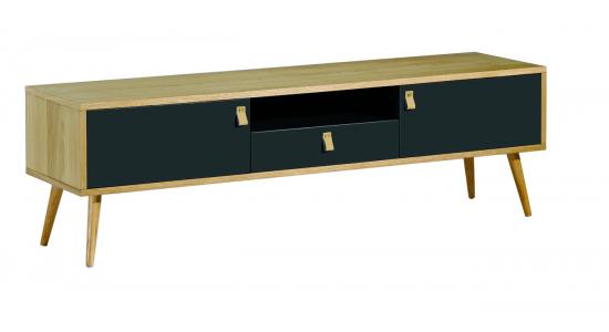 Mesa de TV y sonido con chapilla y patas en roble, tres repisas tres cajones y tres compartimentos en color madera y negro
