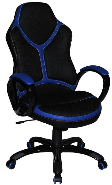 Silla gerencial para oficina en base en plástico hecha en tela y cuero sintético azul de colores negro y azul con apoya brazos nivel de altura mecanismo graduación en el asiento Espaldar ergonómico, ajustable en ángulo en una posición de bloqueo.