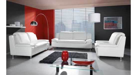 Sofá fabricado en cuero color blanco, sus patas de metal, y diseño dinámico le dan un estilo fresco, ideal para uso en espacios , combinándolo con paredes de diferentes colores.