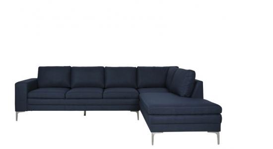 Sofá en l extra largo azul cuatro puestos uno de ellos para recostarse con comodidad, patas en metal ofrece un llamativo estilo que marca la tendencia de espacios grandes