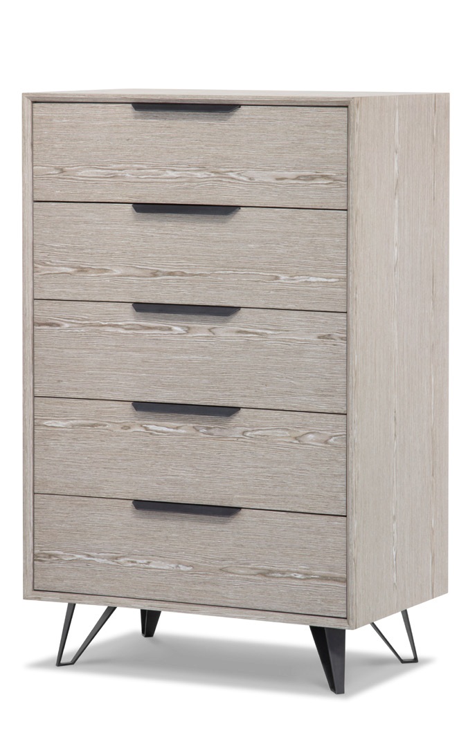 Aparador alto enchapado en MDF con manijas y patas metálicas.