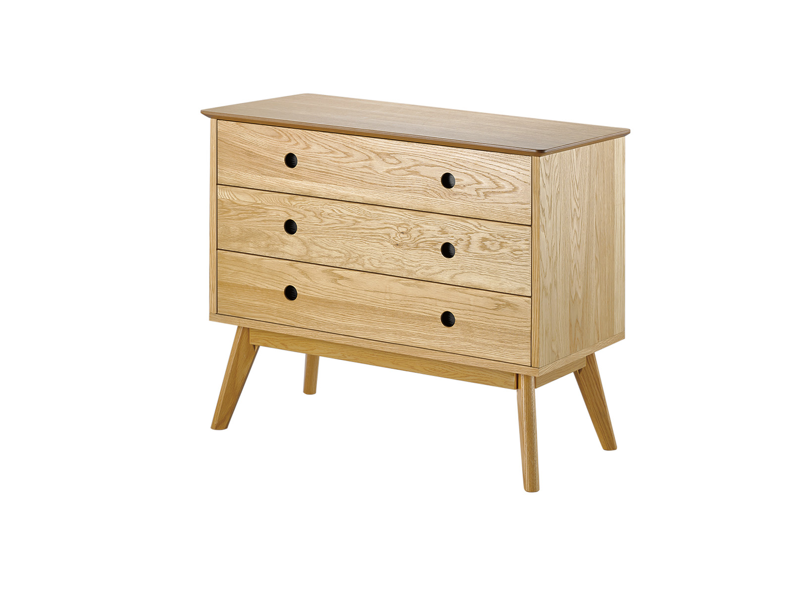 Aparador con tres cajones, MDF de 18mm, con chapilla, manijas y patas en roble.