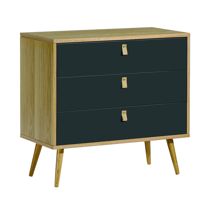 Aparador con chapilla y patas en roble, con 3 cajones, en color madera y negro