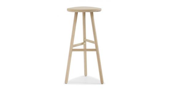 Banca alta hecha en roble superficie en forma circular sus tres patas delgadas.