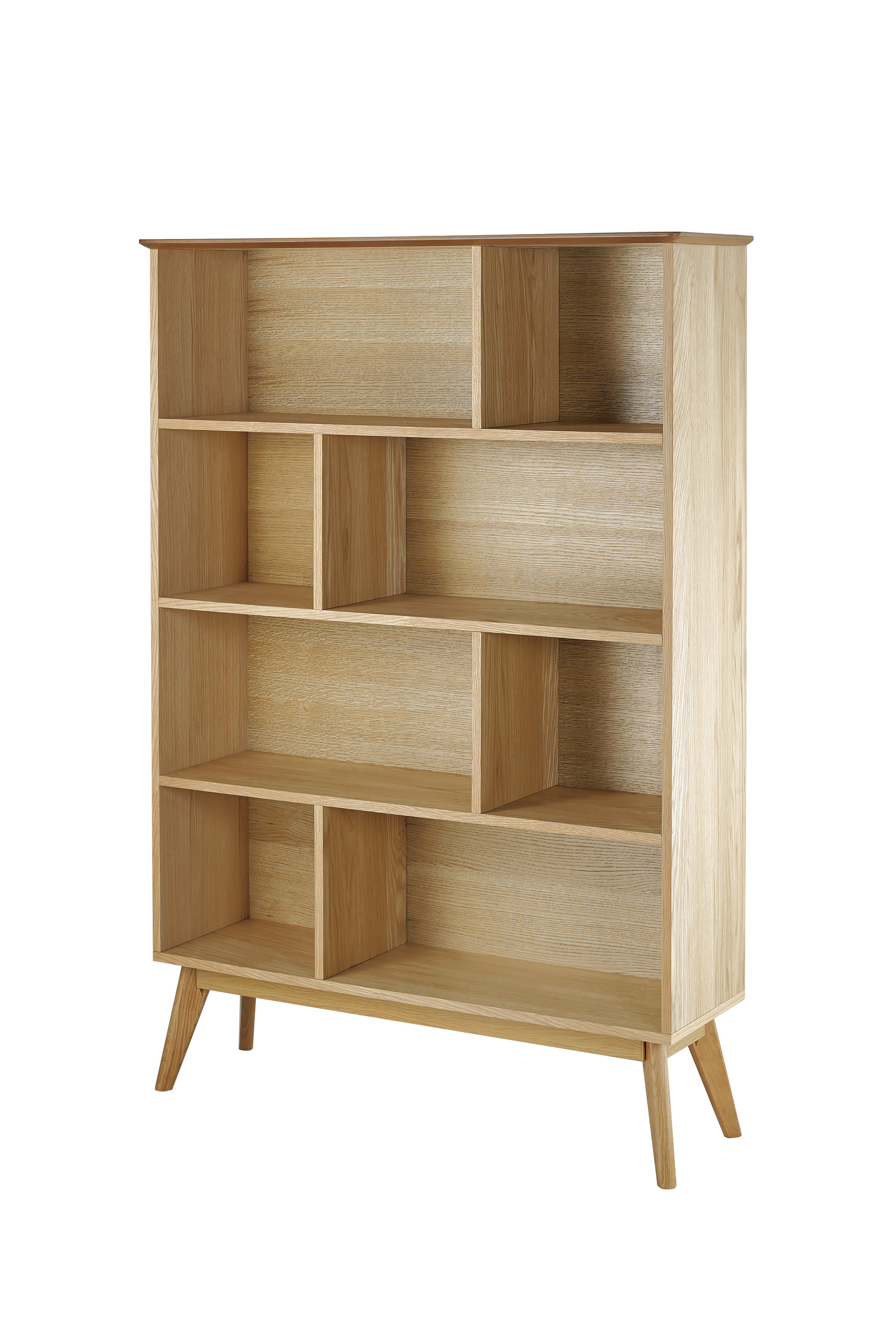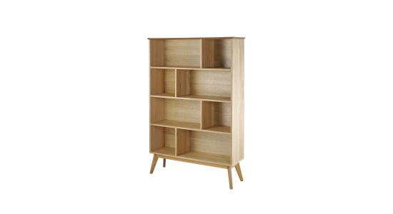 Biblioteca  con ocho repisas, MDF de 18mm, con chapilla y patas en roble.