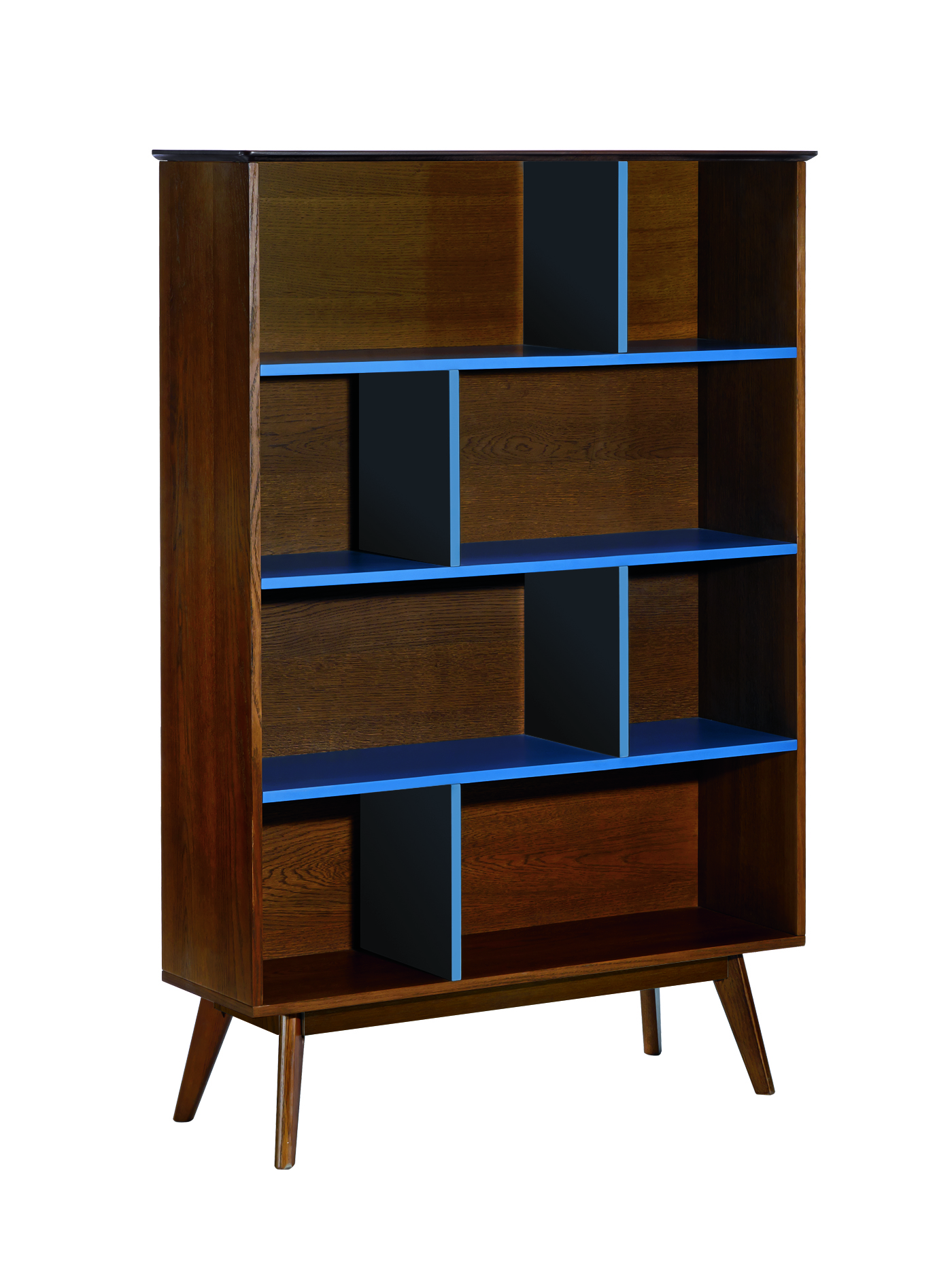 Biblioteca con chapilla y patas en roble, estilo retro con ocho repisas en color roble y PU color azul.