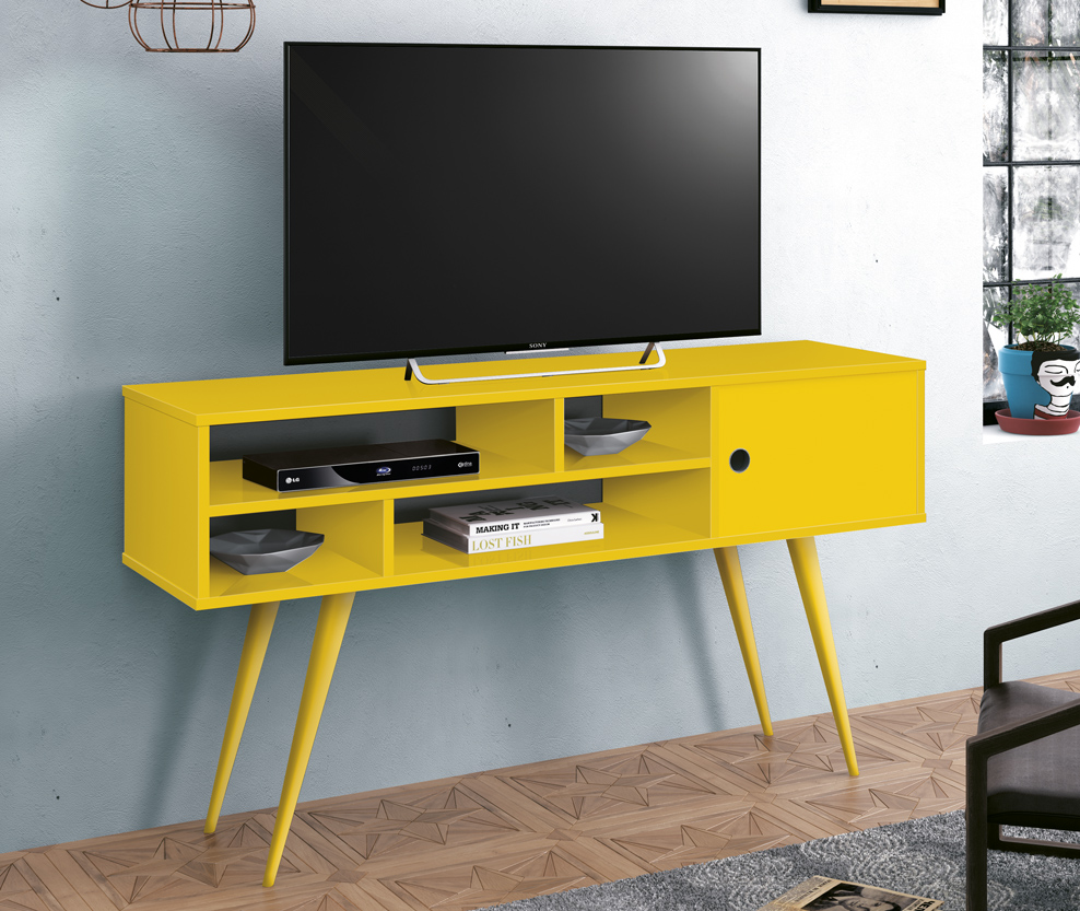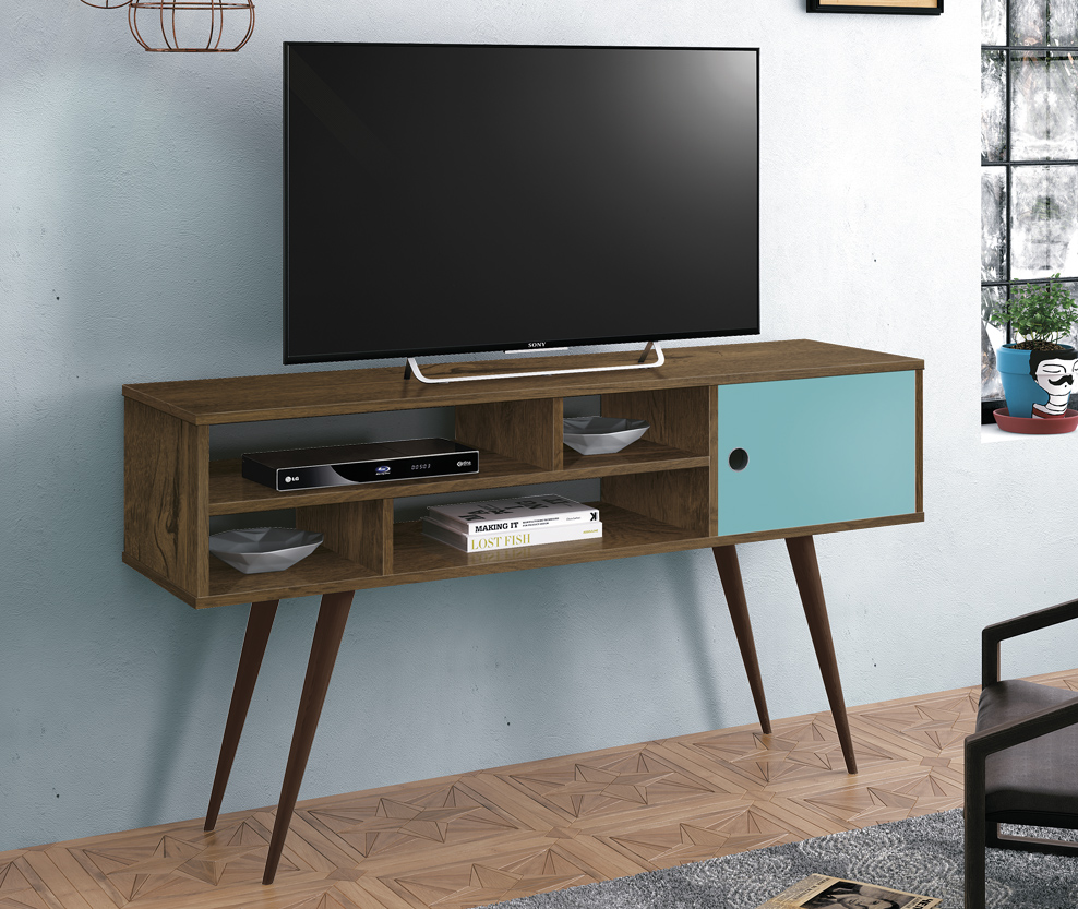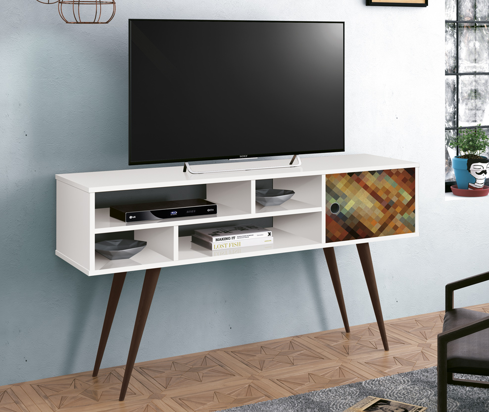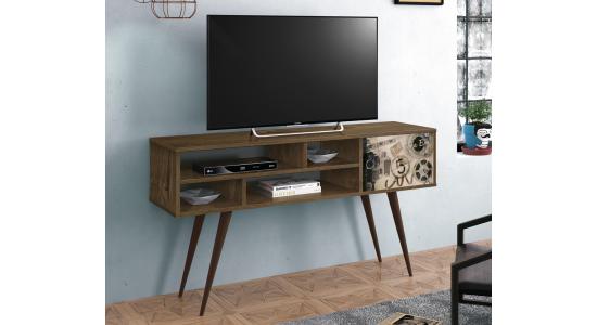 Centro de entretenimiento retro, dos estantes, puerta con imagen retro, patas de madera maciza pintura UV.