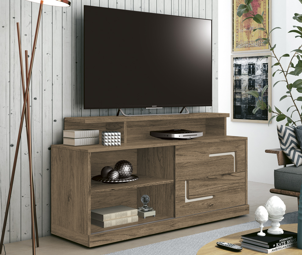 | Centro de entretenimientos retro, cuatro estantes, dos cajones y pintura UV de alta calidad. |