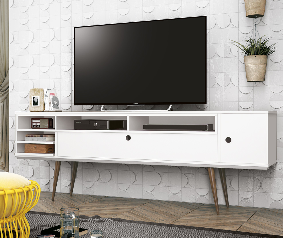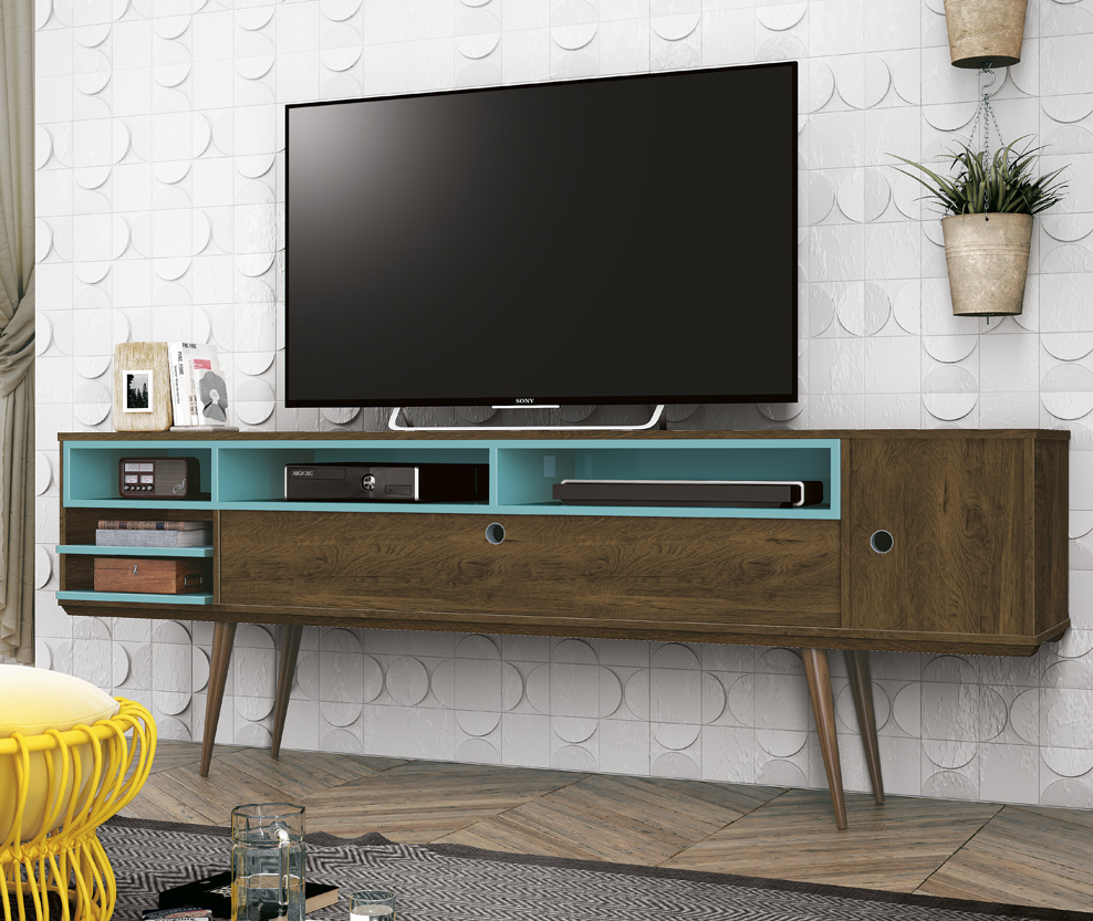 Centro de entretenimiento retro con imagen en puerta, patas en madera maciza y pintura UV de alta calidad.