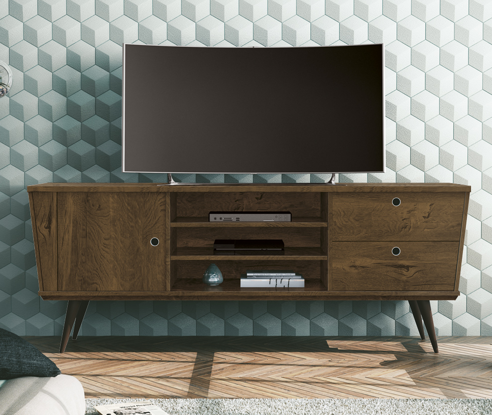 Centro de entretenimiento retro, 1 puerta, 2 cajones, patas en madera maciza, pintura UV de alta calidad.