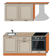 Tablero aglomerado 16m m, Fachada MDF patinado 16mm, Tablero aglomerado de las cajas estándar de la guía del rodillo, Manija del metal, pierna ajustable H100, perchas ajustables, Secado blanco con la paleta. Un zócalo de aglomerado con un sellador. Nota: Versiones con encimera aglomerado 28mm y sin encimera.