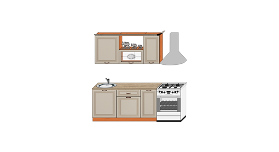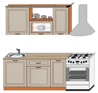 Tablero aglomerado 16m m, Fachada MDF patinado 16mm, Tablero aglomerado de las cajas estándar de la guía del rodillo, Manija del metal, pierna ajustable H100, perchas ajustables, Secado blanco con la paleta. Un zócalo de aglomerado con un sellador. Nota: Versiones con encimera aglomerado 28mm y sin encimera.