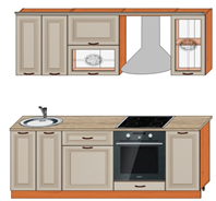 Tablero aglomerado 16m m, Fachada MDF patinado 16mm, Tablero aglomerado de las cajas estándar de la guía del rodillo, Manija del metal, pierna ajustable H100, perchas ajustables, Secado blanco con la paleta. Un zócalo de aglomerado con un sellador. Nota: Versiones con encimera aglomerado 28mm y sin encimera.