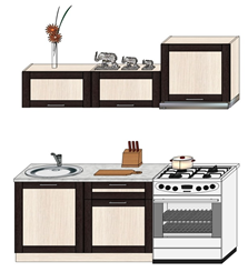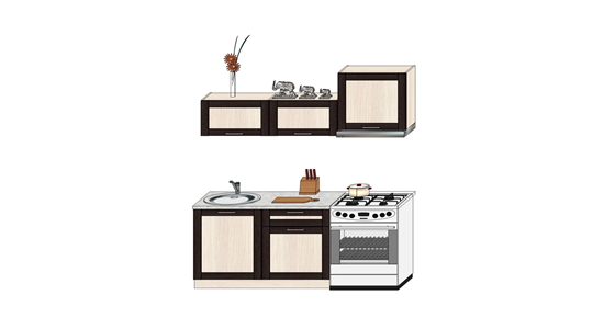 Tablero aglomerado de carcasa 16mm, Fachada MDF en marco MDF, Tablero aglomerado con guía de rodillos estándar, Mango metálico, Pata regulable H100, Perchas regulables, Secado blanco con paleta. Un zócalo de aglomerado con un sellador. Encimera aglomerado 28mm