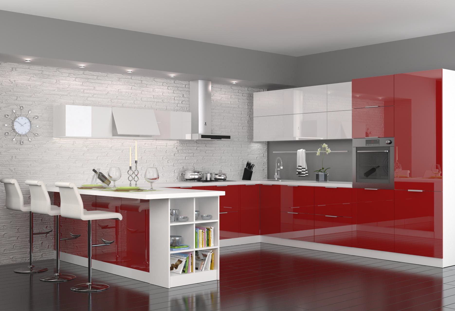 Cocina moderna modular MDF, PVC, alto brillo rojo.