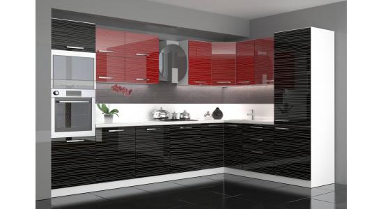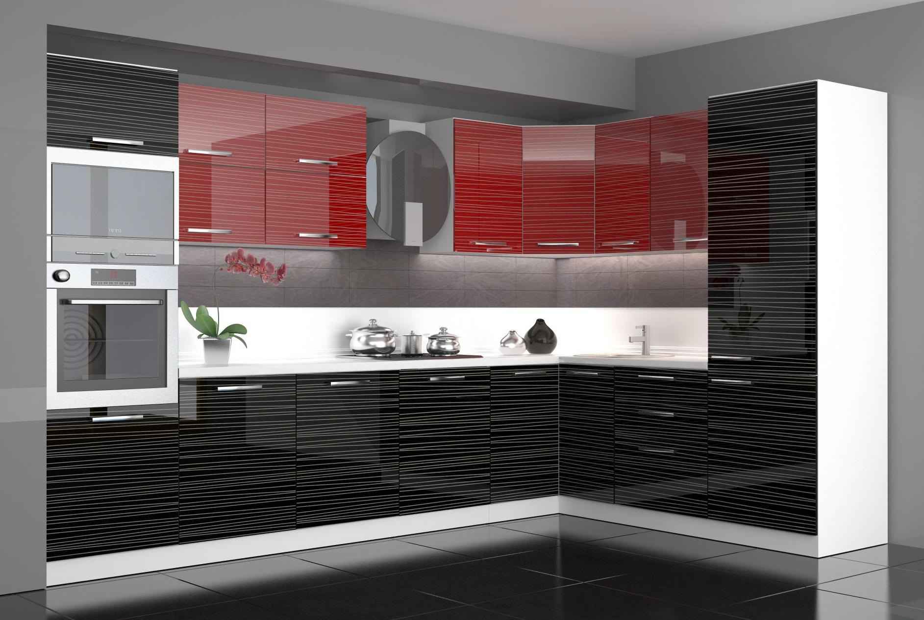 Cocina modular moderna MDF, PVC, negro, alto brillo rojo.