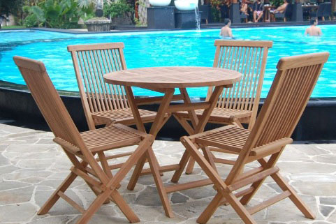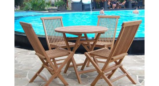 Comedor para exteriores con mesa redonda y sillas plegadizas.