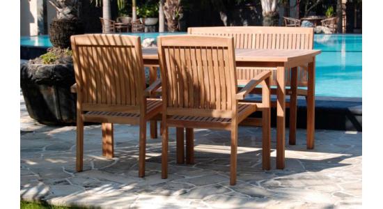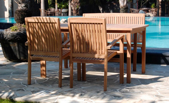 Comedor para exteriores hecho en madera con dos sillas y una banca
