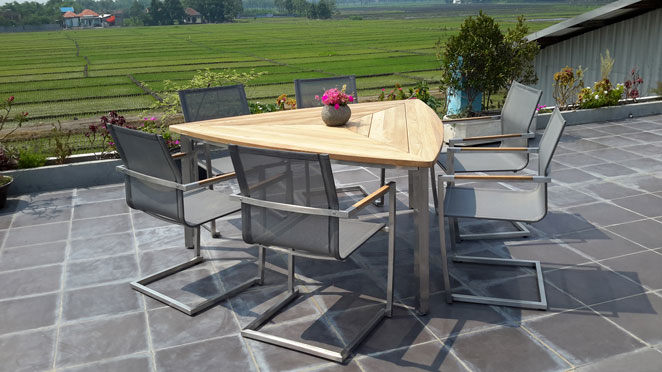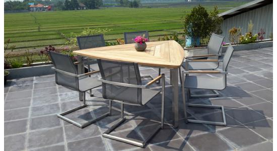 Inicio > Mobiliario > Comedor Para Exteriores Mesa En Forma de Triangulo Para Seis Sillas En Aluminio y Tela