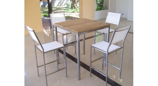 Inicio > Mobiliario > Mesa Alta Para Bar Exteriores Hecha En Metal y Madera Con Sillas Compuestas En Metal y