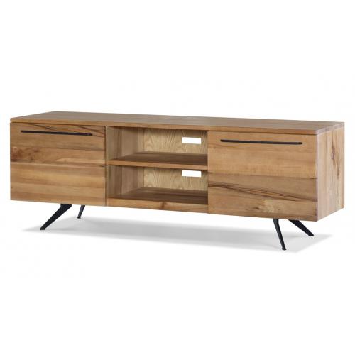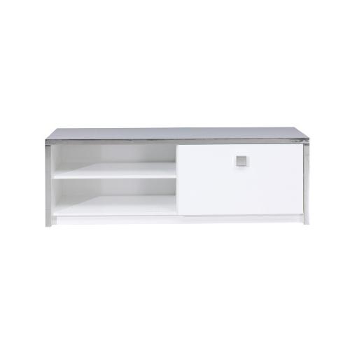 Mesa blanca para TV y sonido en MDF de 18mm, estilo retro con un compartimento, cuatro repisas, dos cajones estructura y patas en roble.