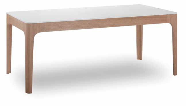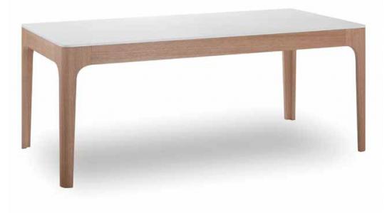 Mesa comedor MDF tapa mate blanca con paneles de chapa de roble