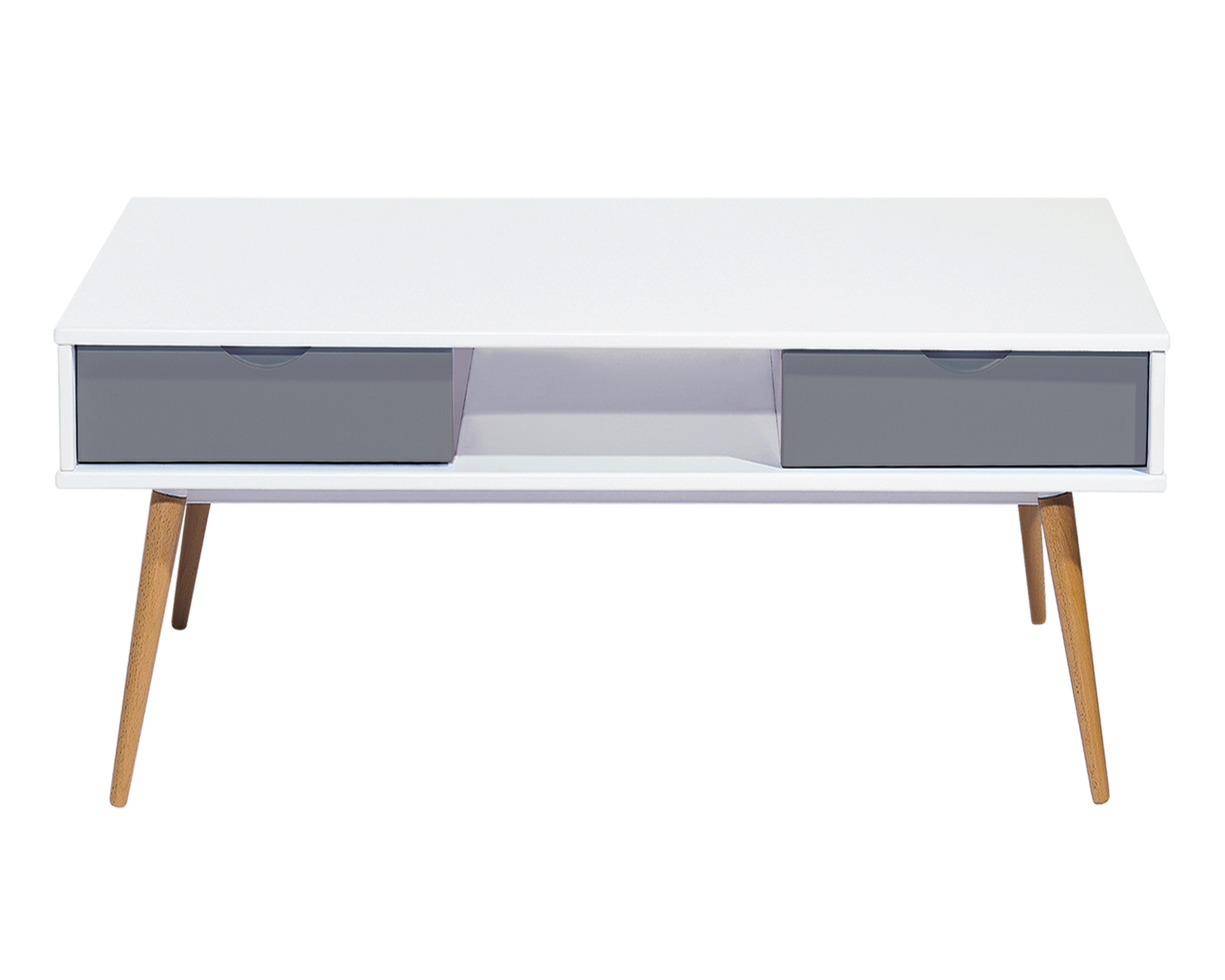 Mesa de café con dos cajones y una repisa, MDF 15mm, pintura PU en blanco y gris, patas mazisas en madera de haya.