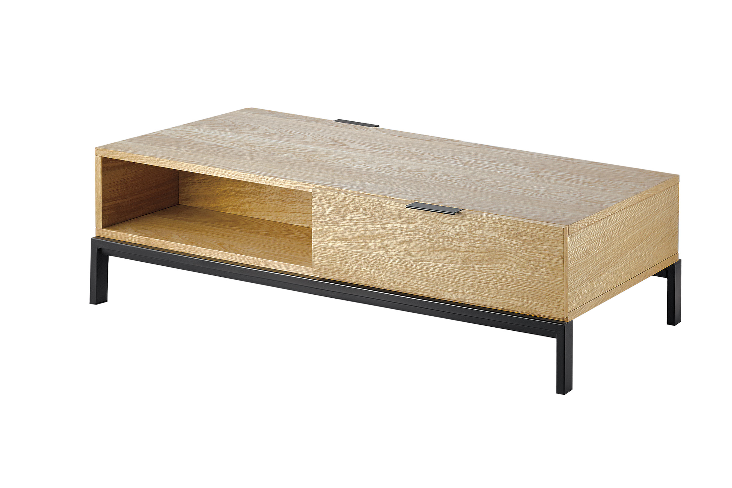 Mesa de café con una repisa y un compartimento, estilo retro, con chapilla de roble, manija en aluminio y patas en metal negro pintado
