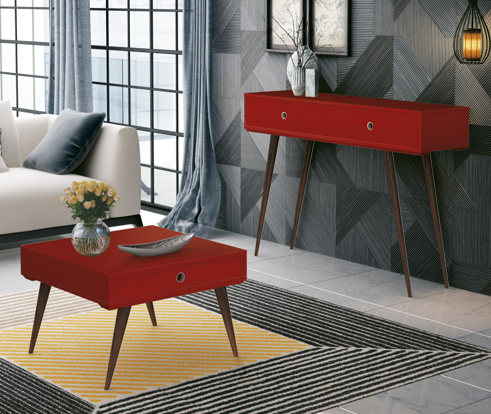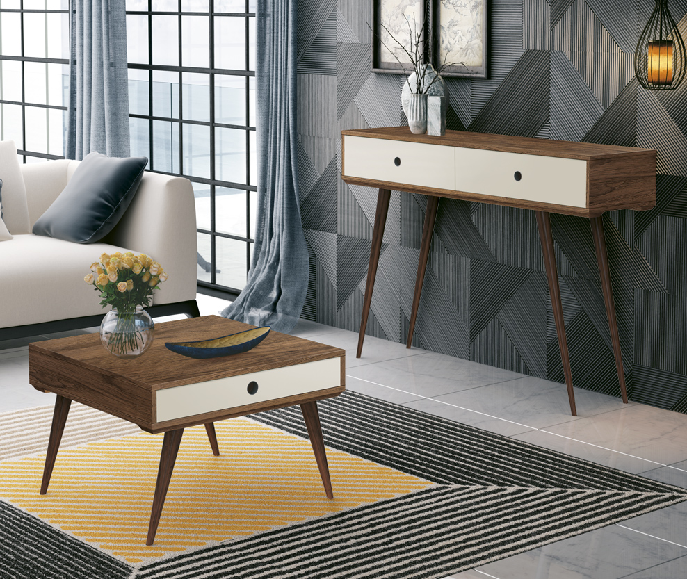 Mesa cuadrada retro, patas en madera maciza, un cajón, armazón reforzado, pintura UV de alta calidad.