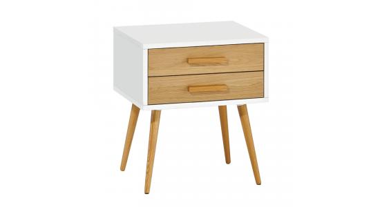 Mesa de noche en MDF de 18 mm ,PU blanco, dos cajónes con chapilla de roble y patas mazisas en madera de roble.