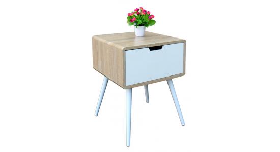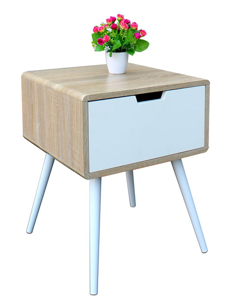 Mesa de noche con un cajón manija en hueco sus patas en metal delgadas