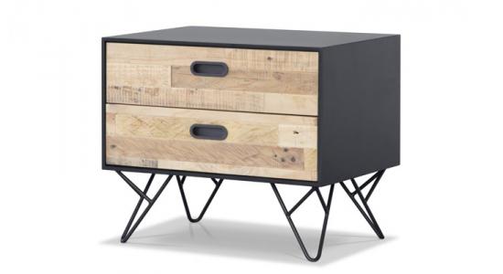 Mesa de noche en madera de pino reciclada sus patas en metal con dos cajones