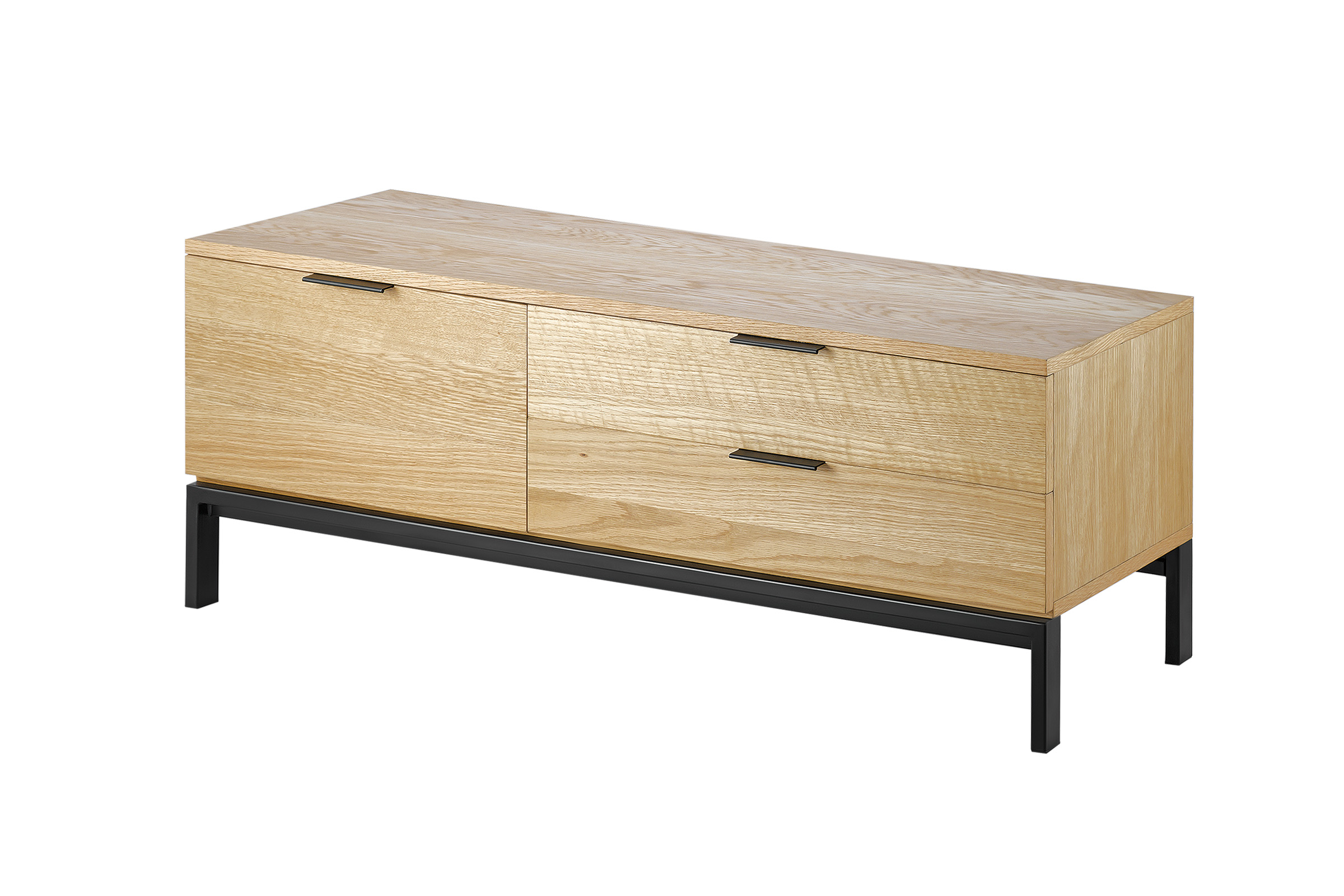 Mesa de TV y sonido con dos cajones y un compartimento, 18mm estilo retro, con chapilla de roble, manijas en aluminio y patas en metal negro pintado