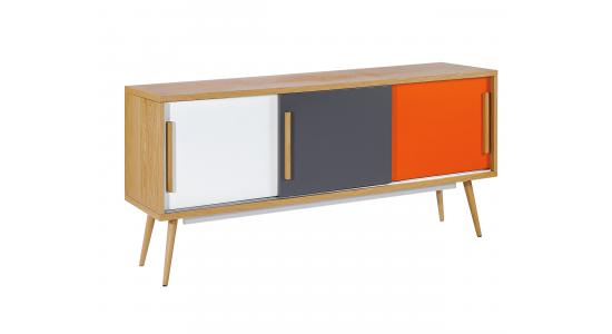Mesa de TV y sonido en chapilla de roble, tres compartimentos, puertas corredizas, MDF 15mm, pintura PU en naranja, gris y blanco, patas mazisas en madera de roble.