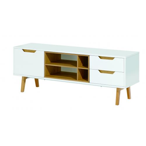 Mesa de TV y sonido, con tres repisas tres cajones y tres compartimentos.