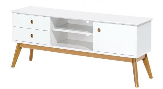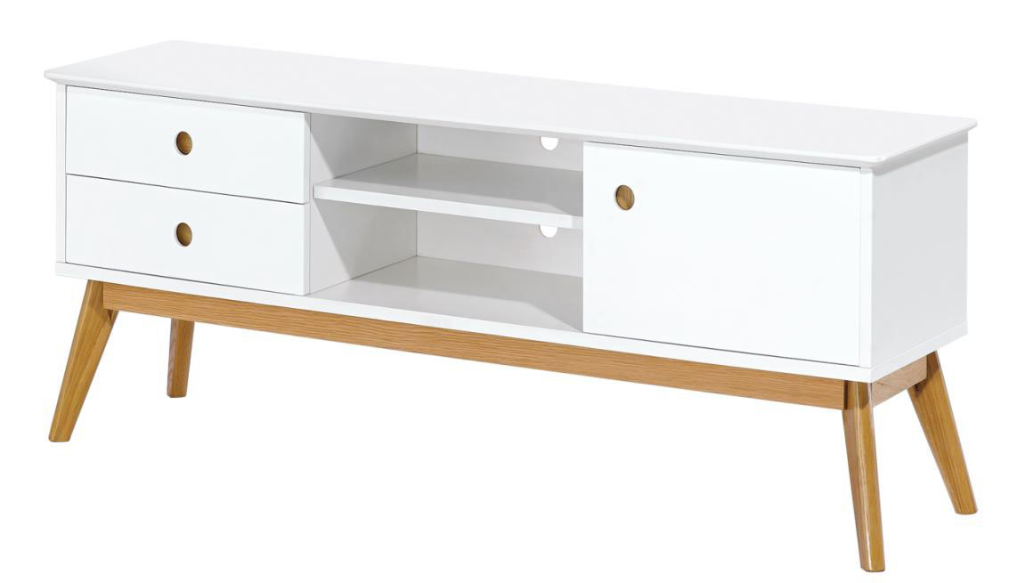 Mesa de TV fabricada en madera con dos cajones en la parte izquierda un compartimento en la derecha su repisa en el centro y agujeros en su parte trasera para el cableado