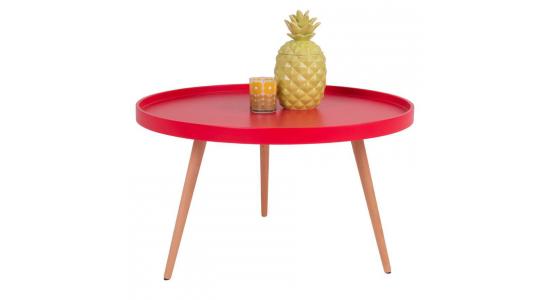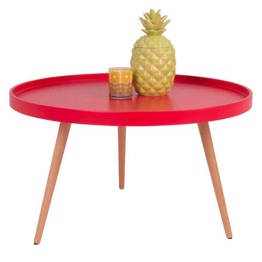 Mesa redonda roja con forma de bandeja y tres patas en roble