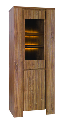 Repisa en madera laminada con iluminación y delicadas líneas talladas