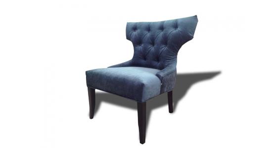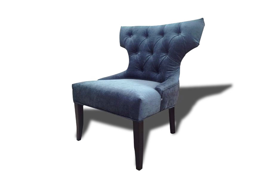 Silla Azul con incrustación en botones, patas en madera solida y tela suave.
