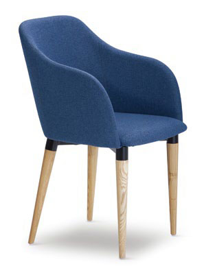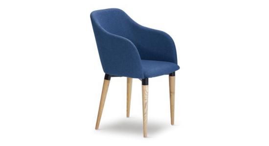 Silla azul en tela con patas en madera con apoya brazos y gran diseño